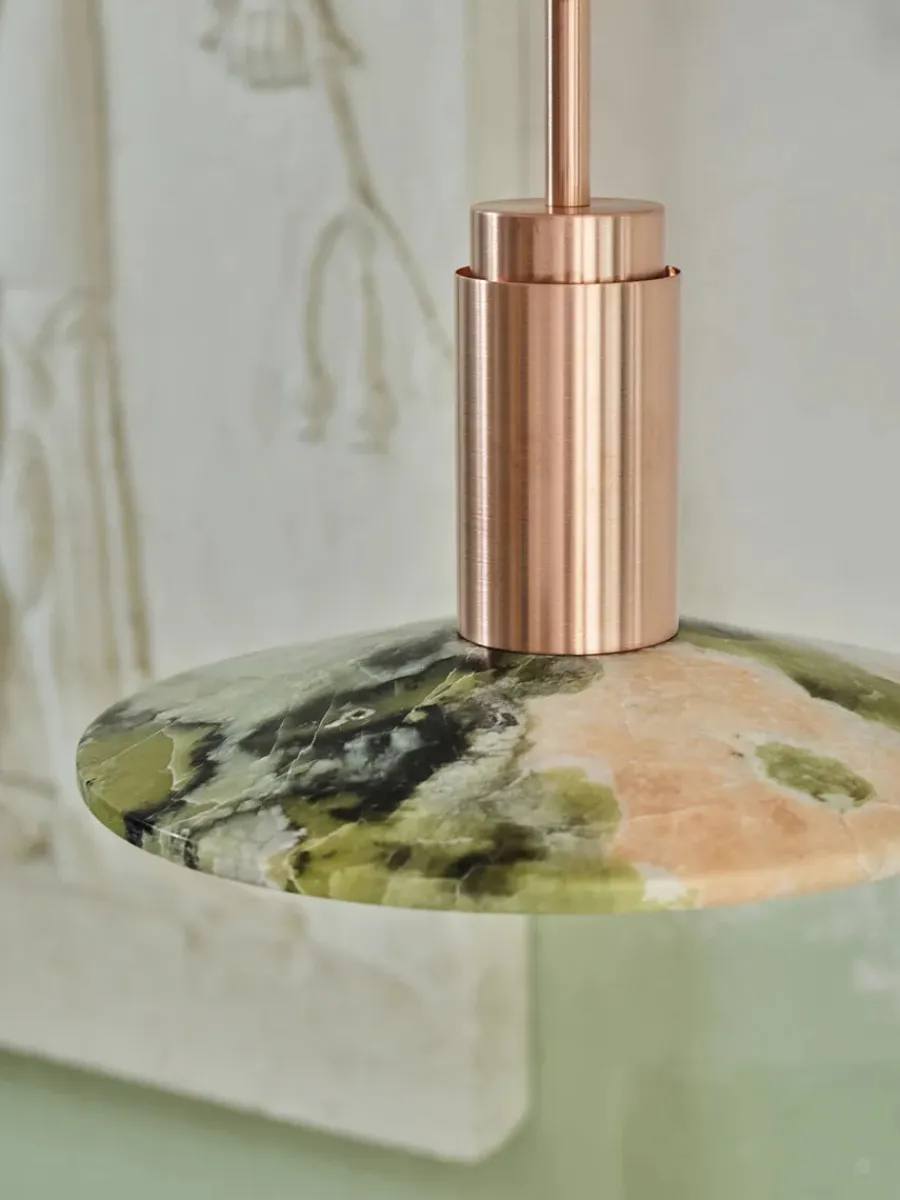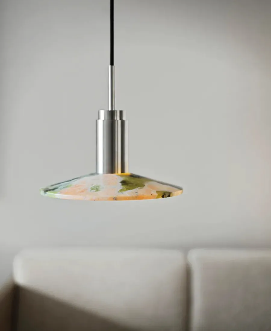 Nu fås Donya lampen fra Anour med skønne skærme i sten. Lampeskærmen her er i mixet Onyx, hvor der både er rødt/orange, hvidt og grønt. Onyx er en natursten, som er fyldt med harmoni og i skønne farver. Den mixede skærm kommer med, hvad der ligner revner, som giver et skønt og diffust lys. Donya lampen er ideel at bruge over køkkenbordet eller til at sætte sammen flere og så hænge over spisebordet. Da skærmen er i natursten, vil hver eneste Donya ONYX Solar lampe være unik og helt sin egen. Donya lampefatningen kommer i mange forskellige finishes og materialer.