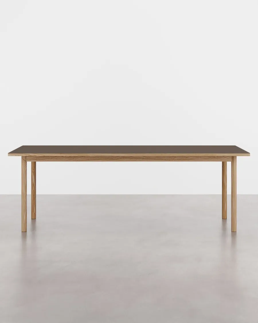 ESSENTIAL OAK Espresso fra Tablelab er et tidløst spisebord hvor varm eg møder en dyb espresso linoleumsoverflade. Den matte taktile top dæmper genskin og føles behagelig i daglig brug mens den lakerede træfinish gør bordet robust og let at vedligeholde. De rene linjer og den solide konstruktion giver et roligt udtryk som er nemt at kombinere med både moderne og klassiske stole. Med de generøse mål er der god plads til alt fra hverdagsmåltider til lange aftener i godt selskab og materialernes kvalitet sikrer et bord der holder sig smukt over tid.