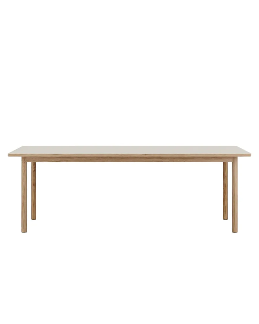 ESSENTIAL OAK i farven Mushroom er spisebordet der samler rummet om en rolig base. Den matte linoleumsoverflade i Mushroom føles blød og indbydende, og den varme eg rammer bordpladen ind med et rent, møbelklassisk udtryk. Med længde på 220 centimeter og bredde på 90 centimeter får du en generøs arbejdsflade der giver luft omkring hver kuvert uden at føles dominerende i rummet. Proportionerne er afstemt, så bordet opleves stabilt og let på samme tid, og den lakerede træfinish gør det enkelt at holde overfladerne pæne i hverdagen. Linoleum er et naturligt materiale baseret på linolie og harpiks som står flot mod træets struktur og dæmper genskin ved brug af stearinlys og arbejdslamper. ESSENTIAL OAK er skabt til at bære både måltider, lektier og kreative pauser, og farvetonen Mushroom balancerer smukt mellem varm beige og grå, så bordet glider elegant ind i både lyse nordiske interiører og mere stemningsfulde paletter.