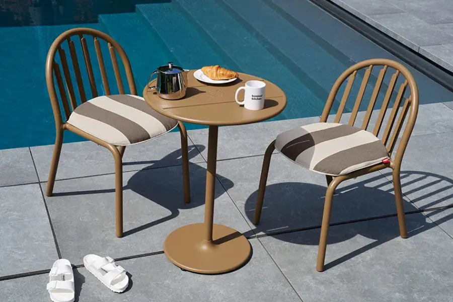 Fred’s Bistreau er et ideelt valg til balkoner, altaner eller små haver. Det runde bistrobord har en robust bordplade af aluminiumslameller. Den tunge støbejernsfod og de justerbare ben under foden, sikrer stabilitet, selv på ujævne underlag. Bordet er fremstillet i vejrbestandige materialer og kan stå ude hele året.