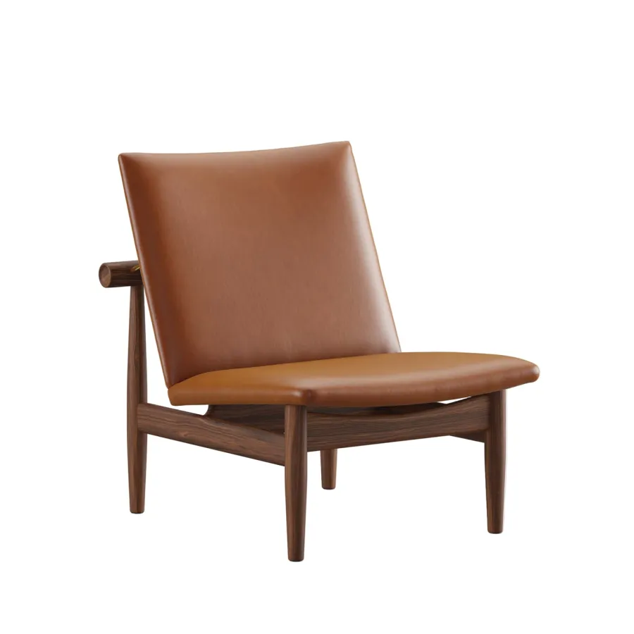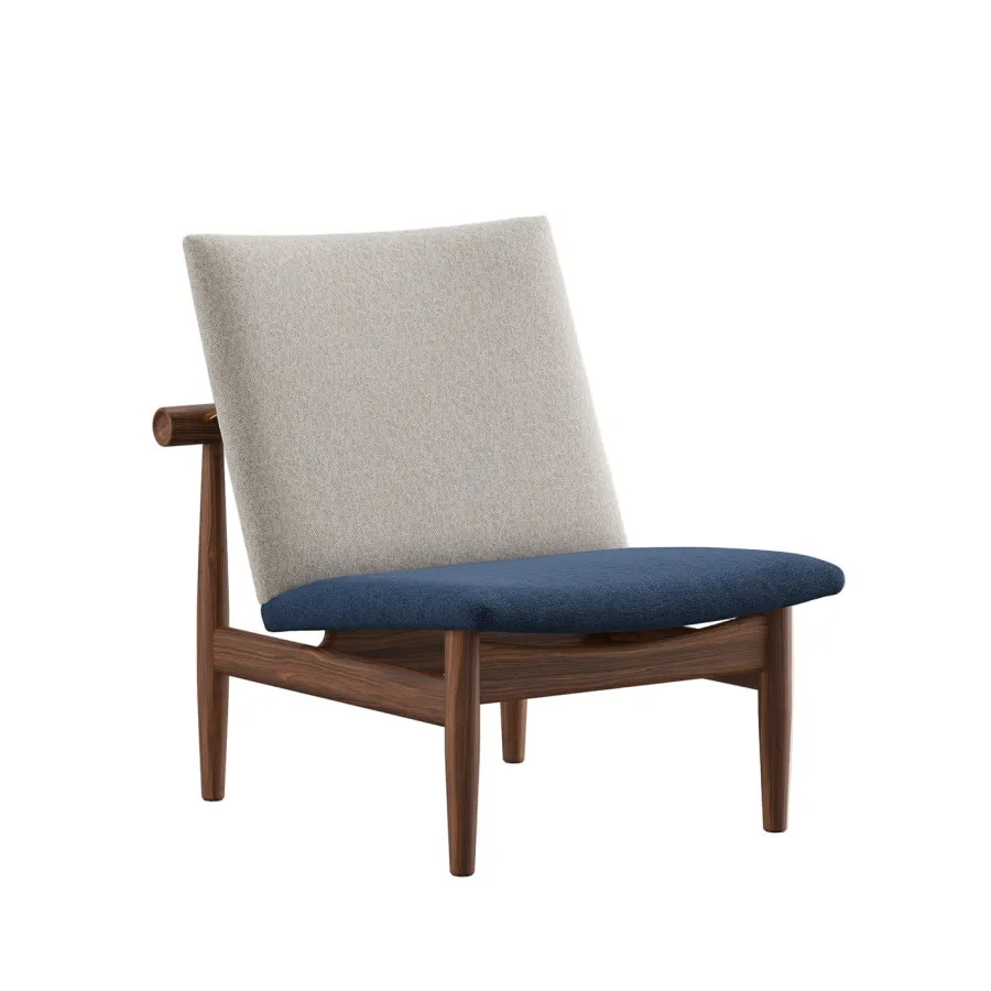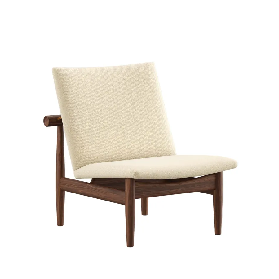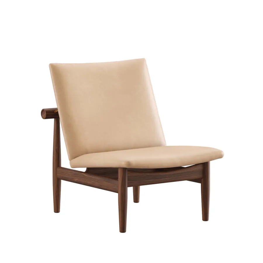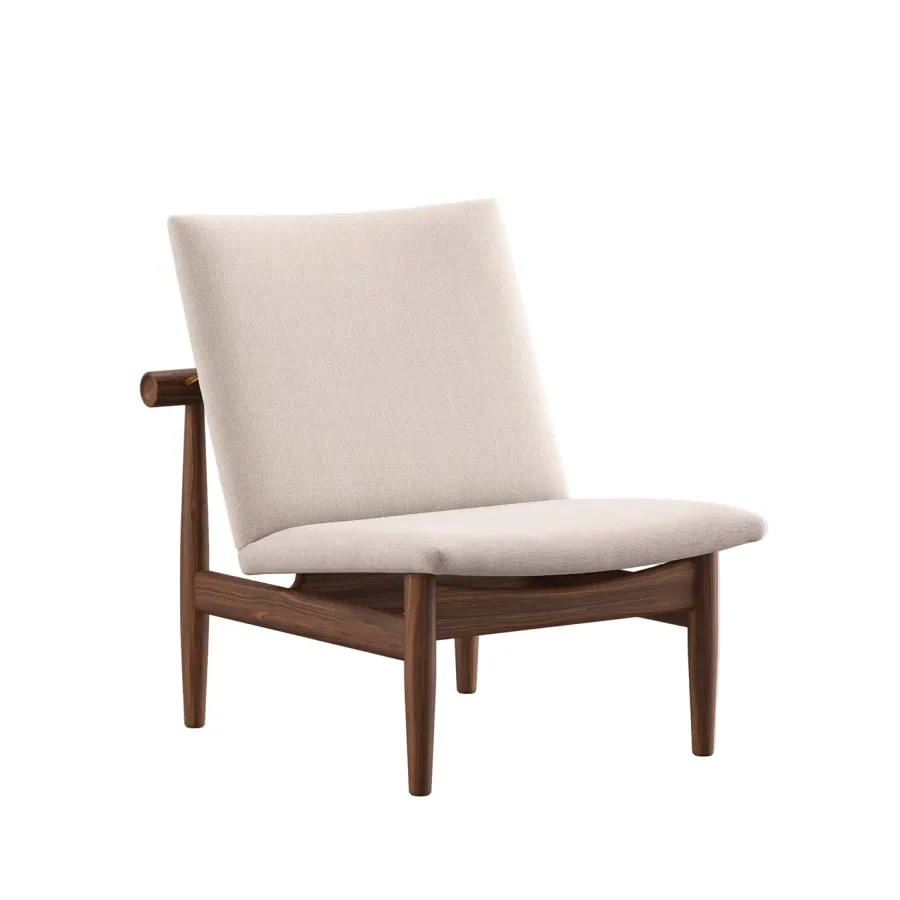 Japan Chair i valnød er et roligt åndedrag af japansk enkelhed og dansk snedkerkunst. Finn Juhl lader det bærende og det bårne træde tydeligt frem med den svævende ryg, adskilt fra stellet af små messingafstandsstykker. Resultatet er en skulpturel loungestol der tilfører varme og raffinement i stuen læsehjørnet eller hotelbaren. Den kompakte størrelse gør stolen nem at placere mens den generøse siddekomfort indbyder til langsomme stunder. Vælg din foretrukne polstring i tekstil eller læder og lad valnøddens glød modne smukt med tiden.