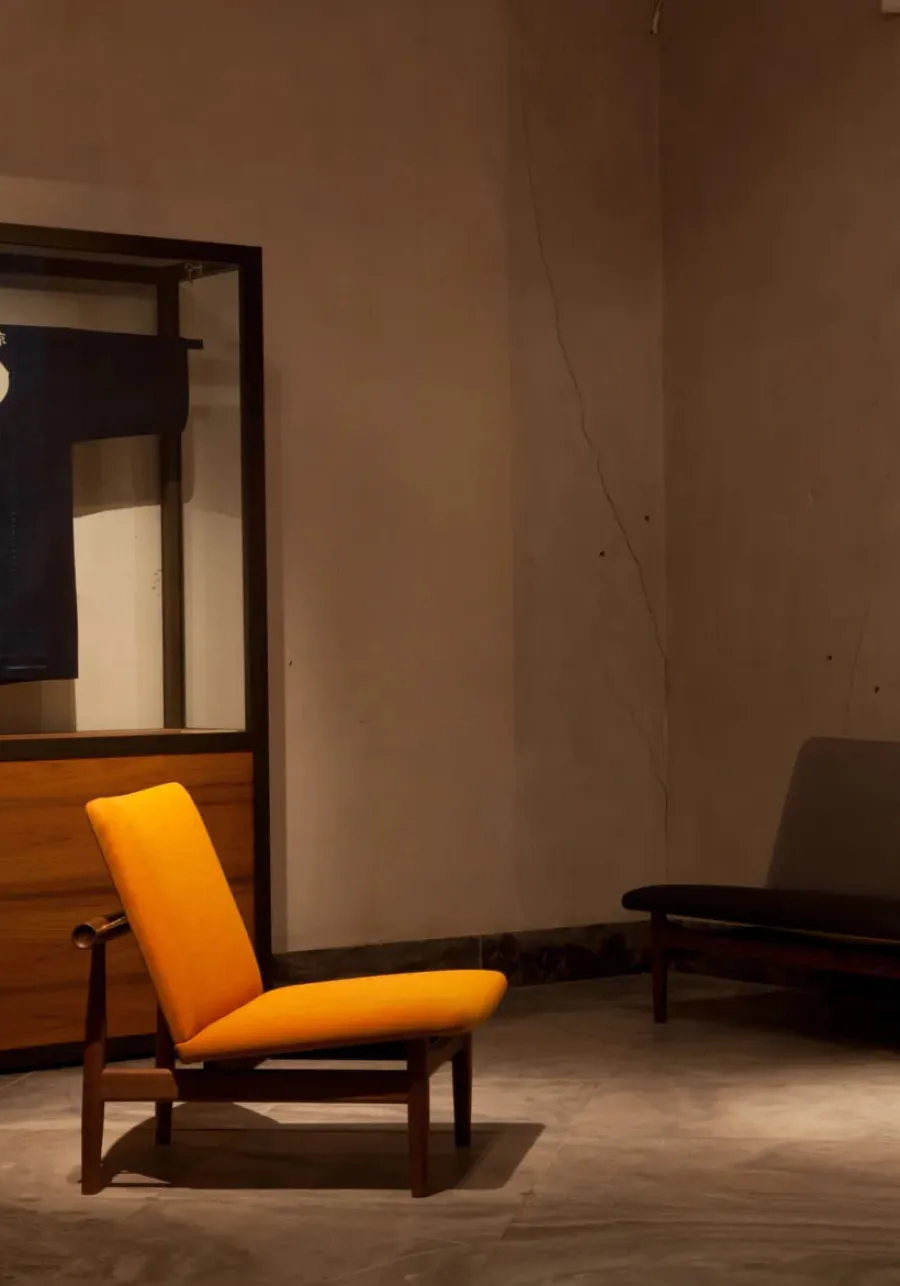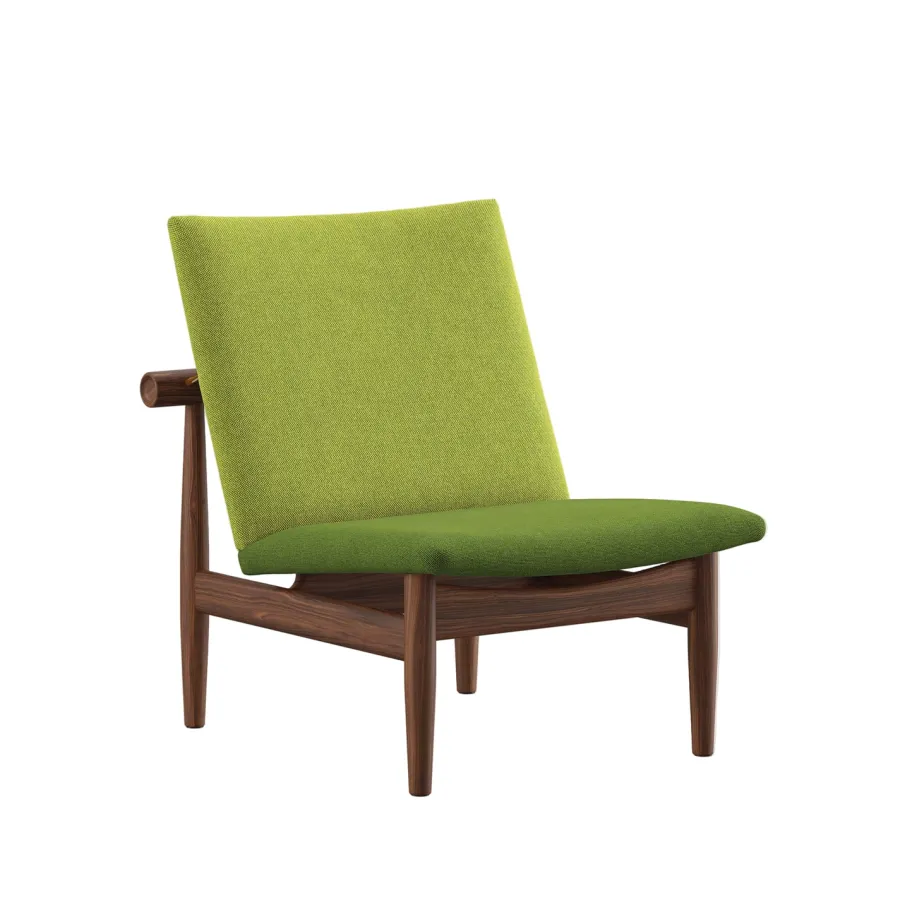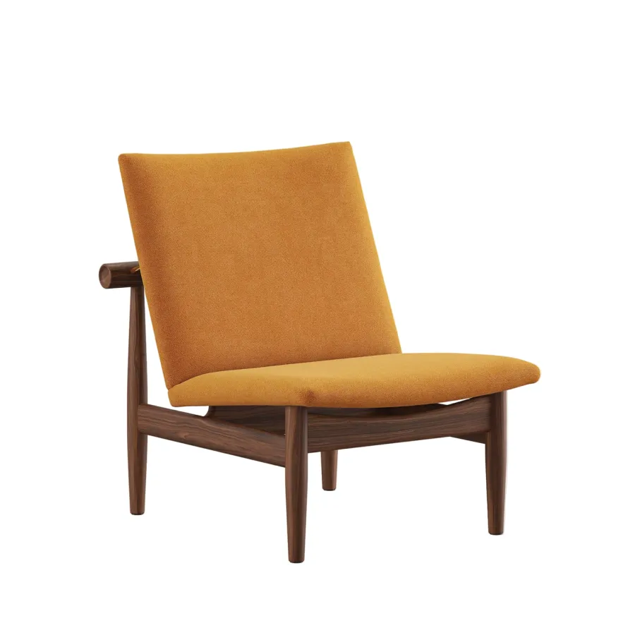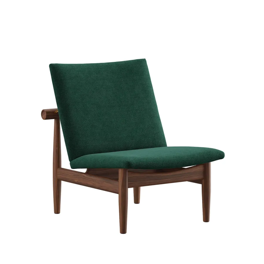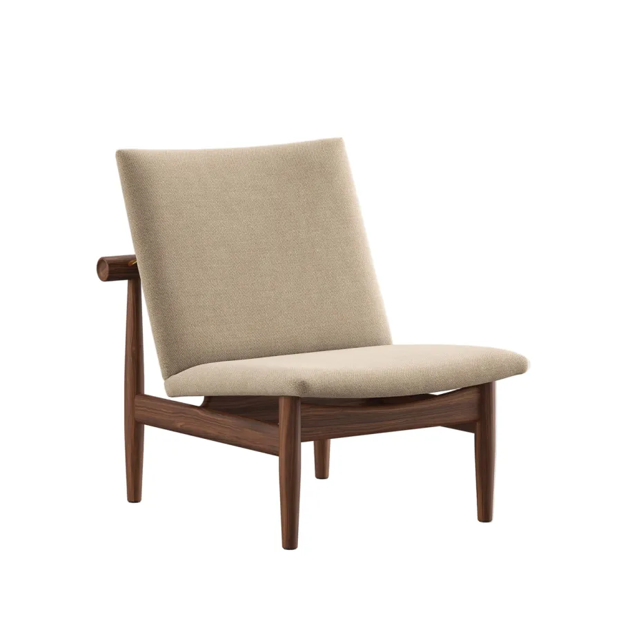 Japan Chair i valnød er et roligt åndedrag af japansk enkelhed og dansk snedkerkunst. Finn Juhl lader det bærende og det bårne træde tydeligt frem med den svævende ryg, adskilt fra stellet af små messingafstandsstykker. Resultatet er en skulpturel loungestol der tilfører varme og raffinement i stuen læsehjørnet eller hotelbaren. Den kompakte størrelse gør stolen nem at placere mens den generøse siddekomfort indbyder til langsomme stunder. Vælg din foretrukne polstring i tekstil eller læder og lad valnøddens glød modne smukt med tiden.