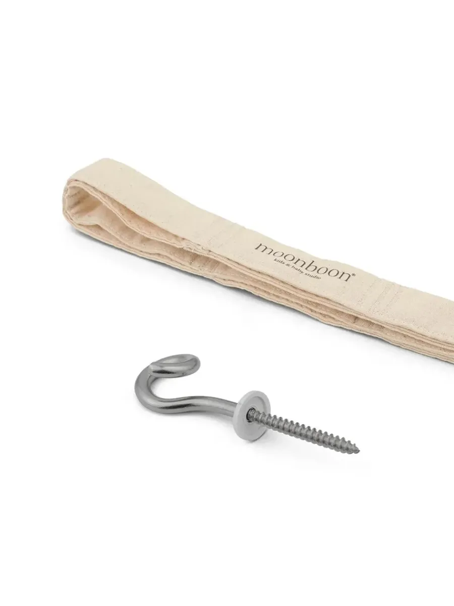 Det er et sikkert og justerbart loftophæng med en loftkrog i rustfrit stål og en slidstærk ophængsstrop i bomuld og nylon, så du kan montere slyngevuggen eller vuggen sikkert og trygt i trælofter, betonlofter eller træbjælker.