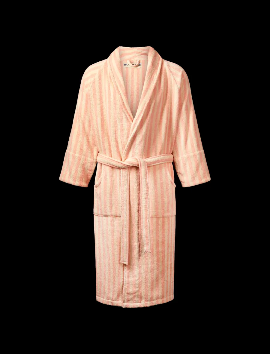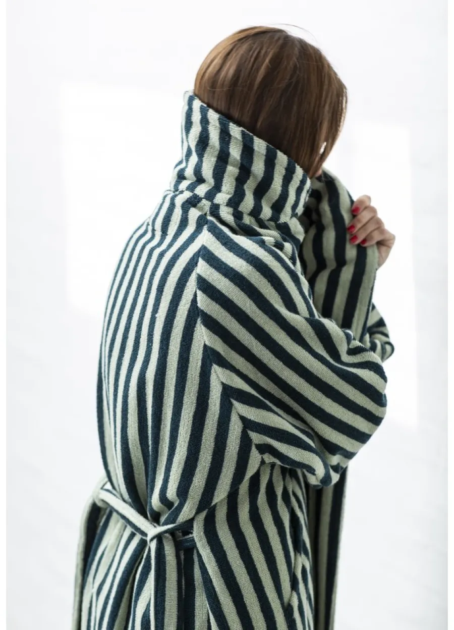 Naram badekåben fra Bongusta i farven Camel & Ultramarine er skabt til langsomme morgener og varme aftener. Den lange, unisex pasform kombinerer klassiske striber med en generøs komfort: sjalkrave, åben front, to rummelige lommer og et kraftigt bælte. Frottéen er 100% kæmmet OEKO-TEX® bomuld vævet i ca. 385 g/m² for høj absorbering og holdbarhed, hvilket giver en blød, poleret overflade vask efter vask. Kåben fås i S/M og L/XL med mål fra nakke til bundsøm på hhv. 122 og 138 cm; er du over 176 cm eller ønsker et mere oversized udtryk, anbefales L/XL. Vaskes ved op til 60° og hænges gerne til tørre for at bevare farver og fibre. Bemærk, at stoffet kan krympe 5–10% efter første vask. Kort sagt: et farverigt, tidløst design med funktionelle detaljer—perfekt efter badet, i sommerhuset eller til et køligt havdyp.