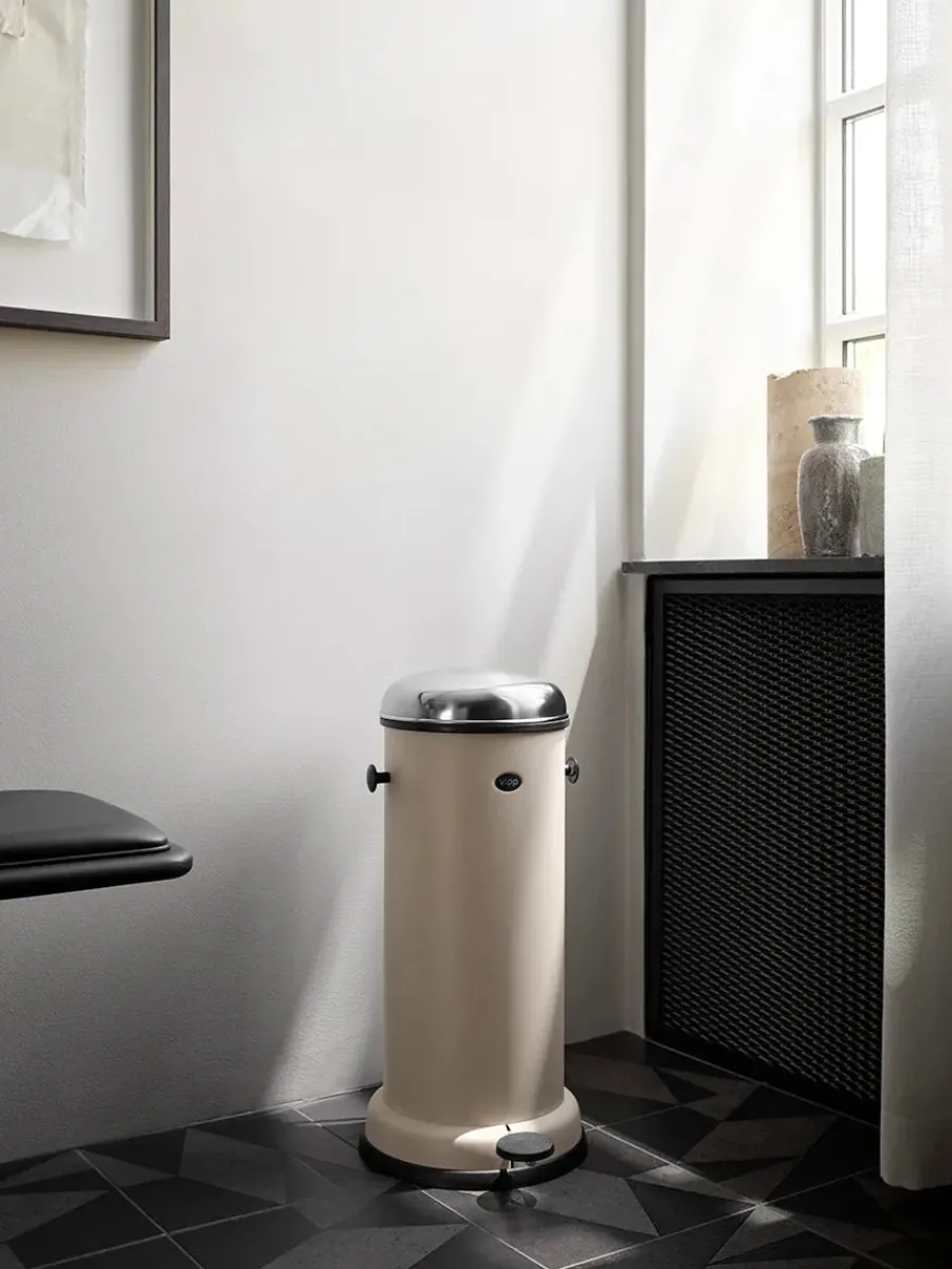 Stainless Steel Collection Nu er de klassiske VIPP spande produceret uden pulverlakering. Det rå, polerede stål tilfører et autentisk look til de smukke og super funktionelle spande. Tilfør tidløse materialer og fantastisk design til dit badeværelse, køkken eller kontor. VIPPs spande er et must i ethvert hjem. Vipp16 pedalspanden er en stor skraldespand til køkkenet, kontoret eller badeværelset. VIPP16 pedalspanden rummer 18 liter og er udstyret med en udtagelig inderspand, et låg der sikrer lufttæt tillukning og en dæmpemekanisme, der lukker spandens låg i en blød bevægelse. En gummiring i bunden beskytter gulvet. Design: Holger Nielsen, 1939 Model: VIPP16 Mål: Ø 30 x H 62 x D 36 cm (Ø målt ved gulvet). Materiale: Rustfrit stål, silikone Volume: 18 liter