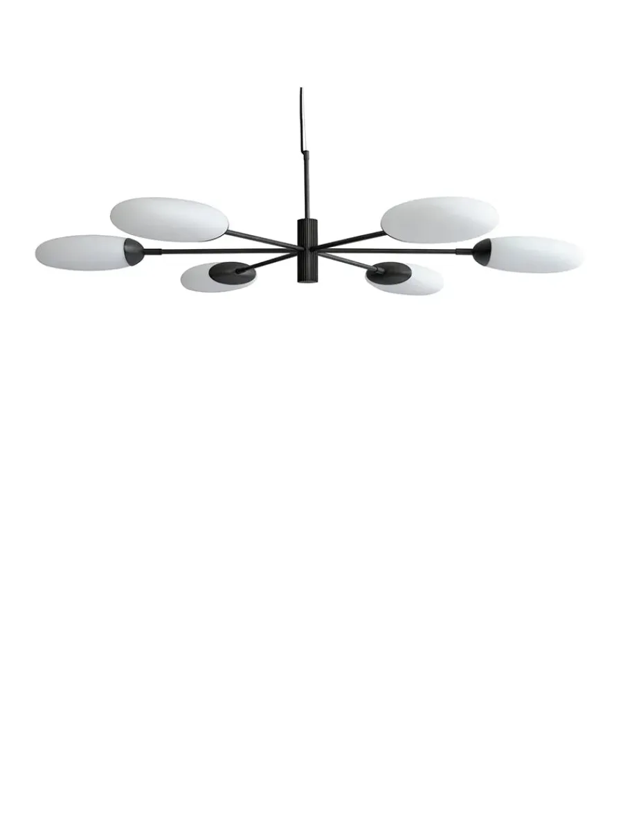 Salon lysekrone grande fra 101 Copenhagen er smuk og elegant. Lysekronen er en minimalistisk fortolkning af de klassiske lysekroner fra midten af det 20. århundrede med et moderne twist. Kendetegnet for Salon lysekronen er de 6 ovale lampeskærme med mat hvid finish, som er placeret i en letvægtsramme, der danner yderkonturen af en hexagon. En ekstra detalje ved denne lysekrone er den riftlet midterdel, der gør lampen sofistikeret. De ovale lampeskærme gør, at lysekronen kan hænge tæt på loftet.