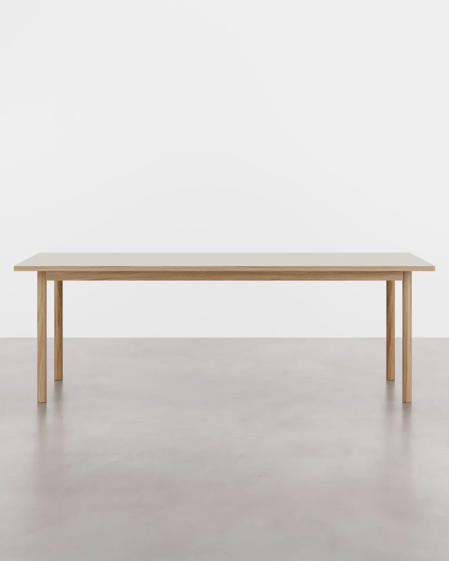 ESSENTIAL OAK i farven Mushroom er spisebordet der samler rummet om en rolig base. Den matte linoleumsoverflade i Mushroom føles blød og indbydende, og den varme eg rammer bordpladen ind med et rent, møbelklassisk udtryk. Med længde på 220 centimeter og bredde på 90 centimeter får du en generøs arbejdsflade der giver luft omkring hver kuvert uden at føles dominerende i rummet. Proportionerne er afstemt, så bordet opleves stabilt og let på samme tid, og den lakerede træfinish gør det enkelt at holde overfladerne pæne i hverdagen. Linoleum er et naturligt materiale baseret på linolie og harpiks som står flot mod træets struktur og dæmper genskin ved brug af stearinlys og arbejdslamper. ESSENTIAL OAK er skabt til at bære både måltider, lektier og kreative pauser, og farvetonen Mushroom balancerer smukt mellem varm beige og grå, så bordet glider elegant ind i både lyse nordiske interiører og mere stemningsfulde paletter.