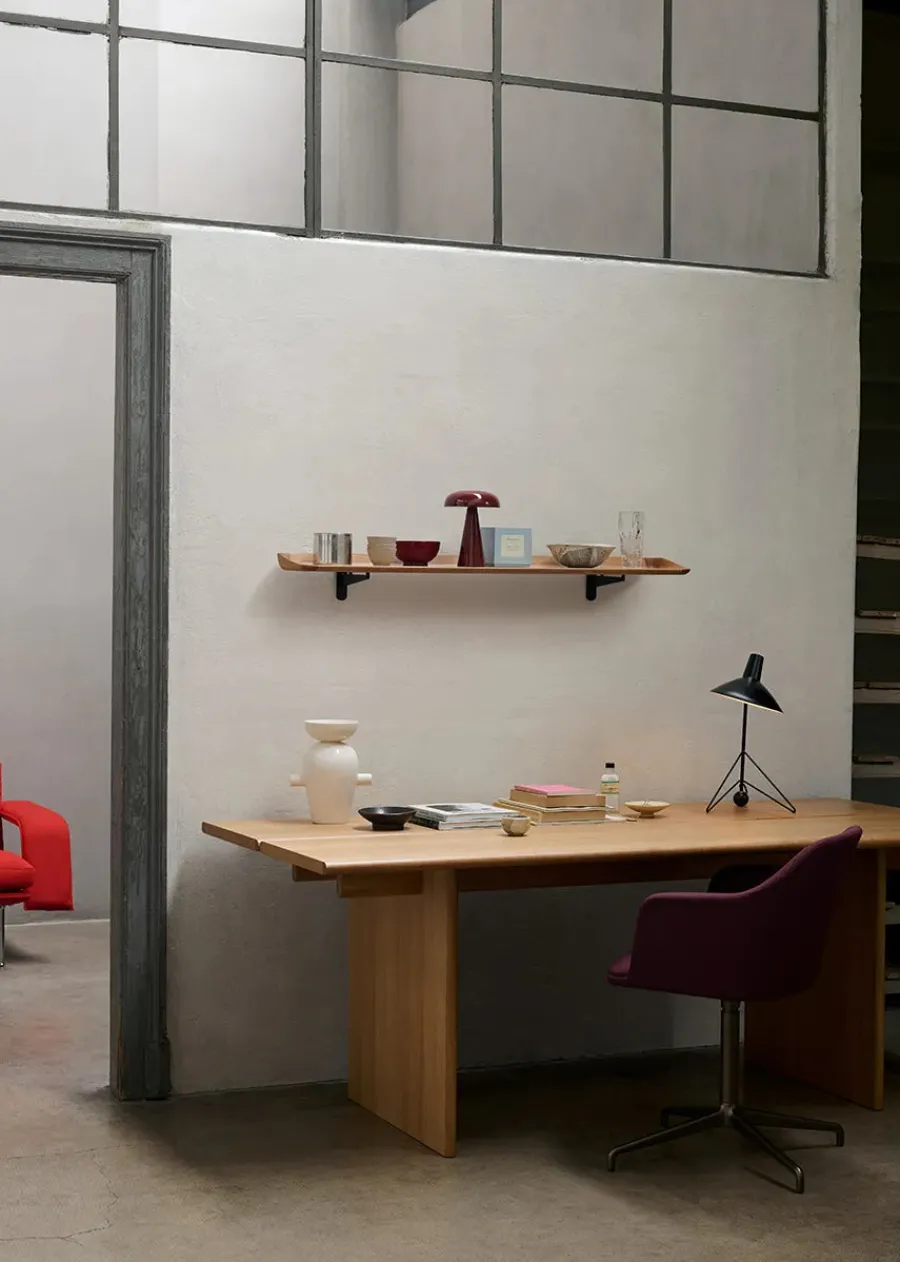 Ita-kollektionen fra &Tradition er designet af OEO Studio og forener skandinavisk og japansk minimalisme. Ita OS2 bordet tilføjer tidløs elegance til ethvert hjem. Bordet er kendetegnet ved bordpladen bestående af to nøje bearbejdede planker, der hviler på brede, men slanke træben. Bordet fås i naturlig eg eller mørkbejdset eg, og fremhæver træets naturlig skønhed. Ita OS2 er et alsidigt bord, der kan bruges både som spisebord eller et stort bord til kontoret eller mødelokalet.