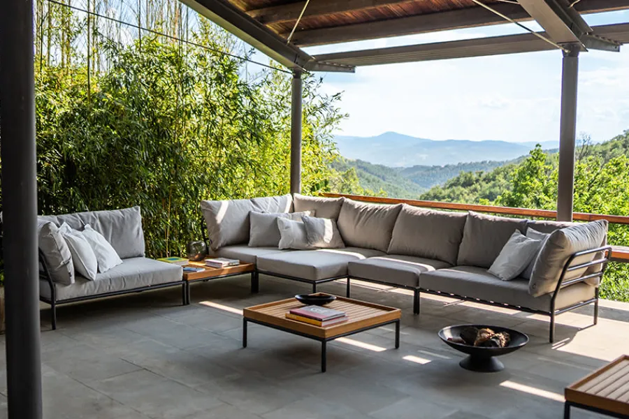Level serien har fået et blødere look i Level 2-serien. Level 2 er i det slidstærke og modstandsdygtige Sunbrella Heritage tekstil. Varianten med Dark Grey hynde er betrukket med polyester. Brug Level 2 udedørs på din terrasse eller i haven som et luksuriøst loungeområde, hvor der kan slappes af og hygges. Level 2 serien er enkel og stilfuld i sit udtryk, og er opbygget af moduler.