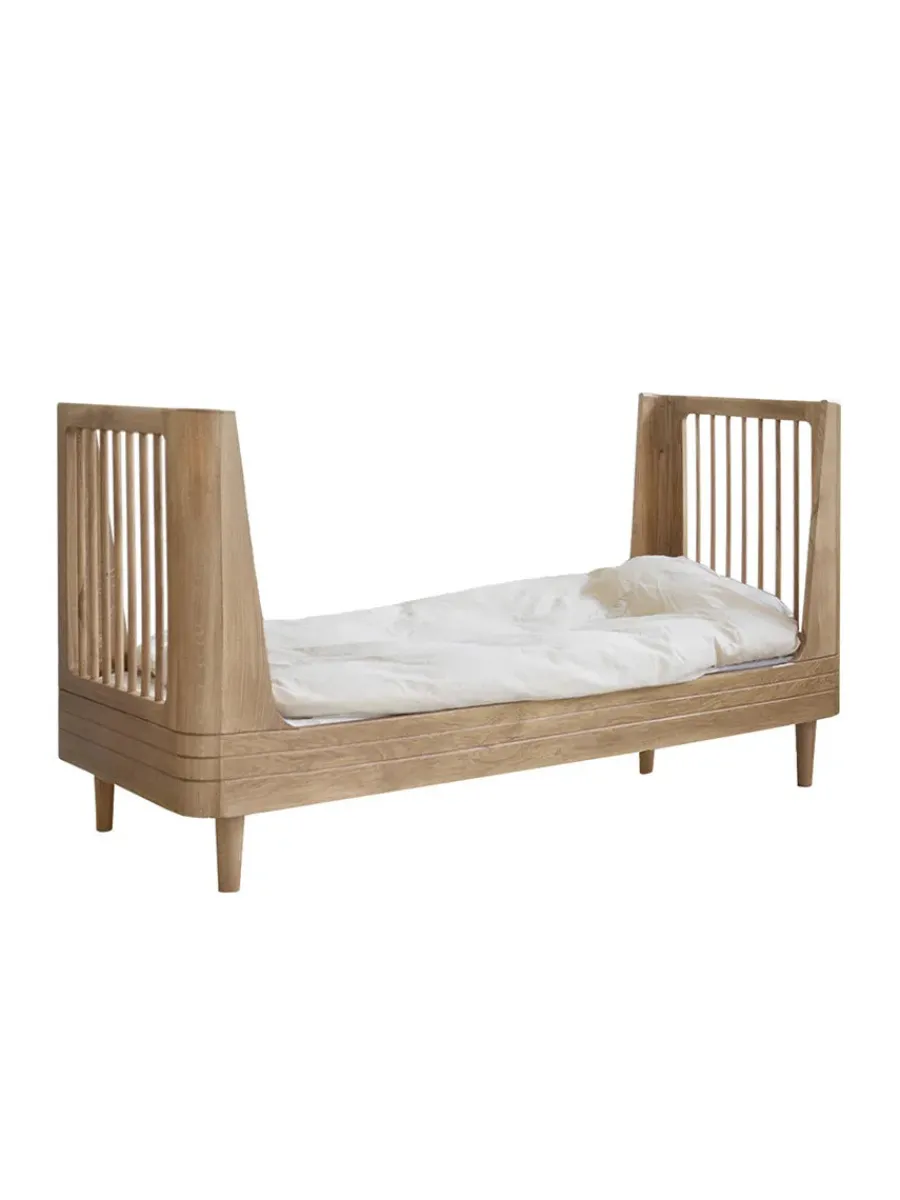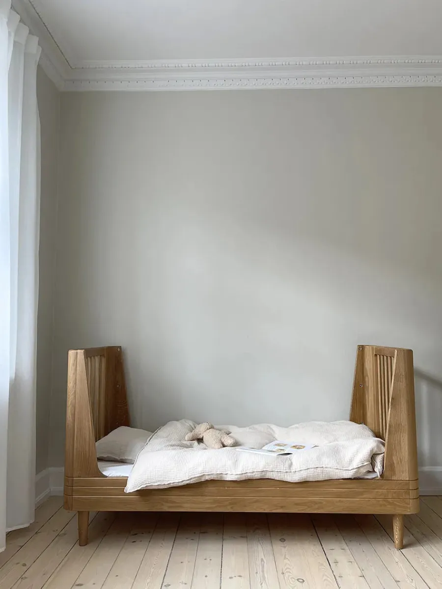 En smuk juniorseng i massivt egetræ, som nu er lavet i en endnu smukkere version – nemlig helt uden synlige skruer! Denne juniorseng skiller sig ud ved at være lavet i massivt egetræ, og den vil passe smukt ind i den skandinaviske enkle indretning. Designet er enkelt og fremstår med rundede detaljer, og det massive egetræ varmer udtrykket endnu mere op. Sengen er testet efter gældende sikkerhedsstandarder.
