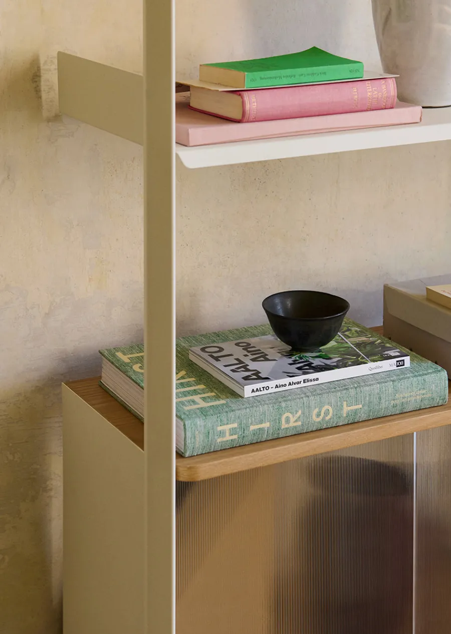 Rombe konfiguration H består af Rombe IF1, IF4 og IF6, som dermed består af både hylder og et skab med riflede glaslåger. Fås med hylder i enten alabaster, eg, anthracite eller valnød. Resultatet er en harmonisk løsning, hvor åbne hylder og skjult opbevaring supplerer hinanden elegant.